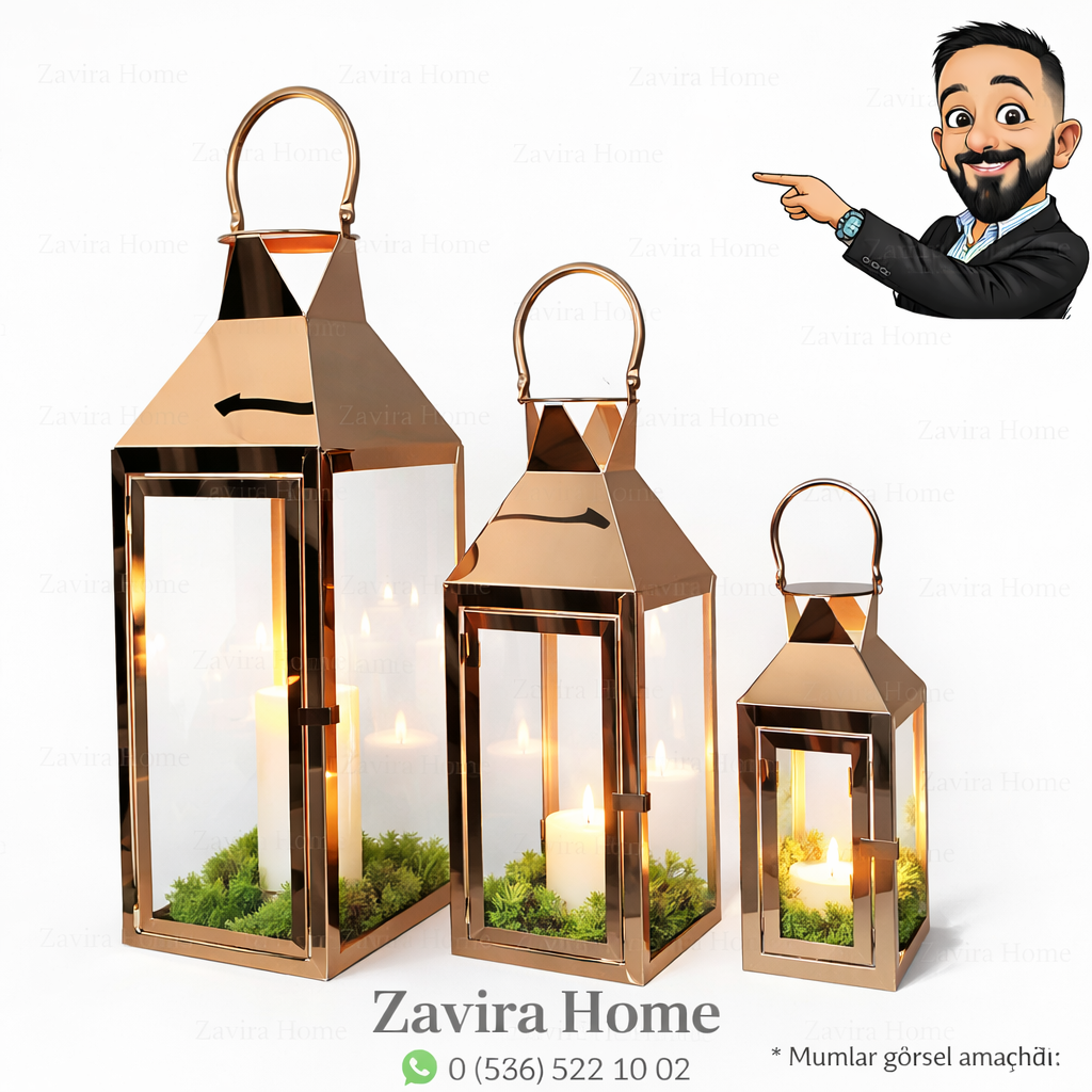 Bakır tonlu metal gövdesi ve cam panelli tasarımıyla bu 3’lü dekoratif fener seti; salon, balkon, antre ve özel davet sofralarınıza estetik bir dokunuş sağlar.